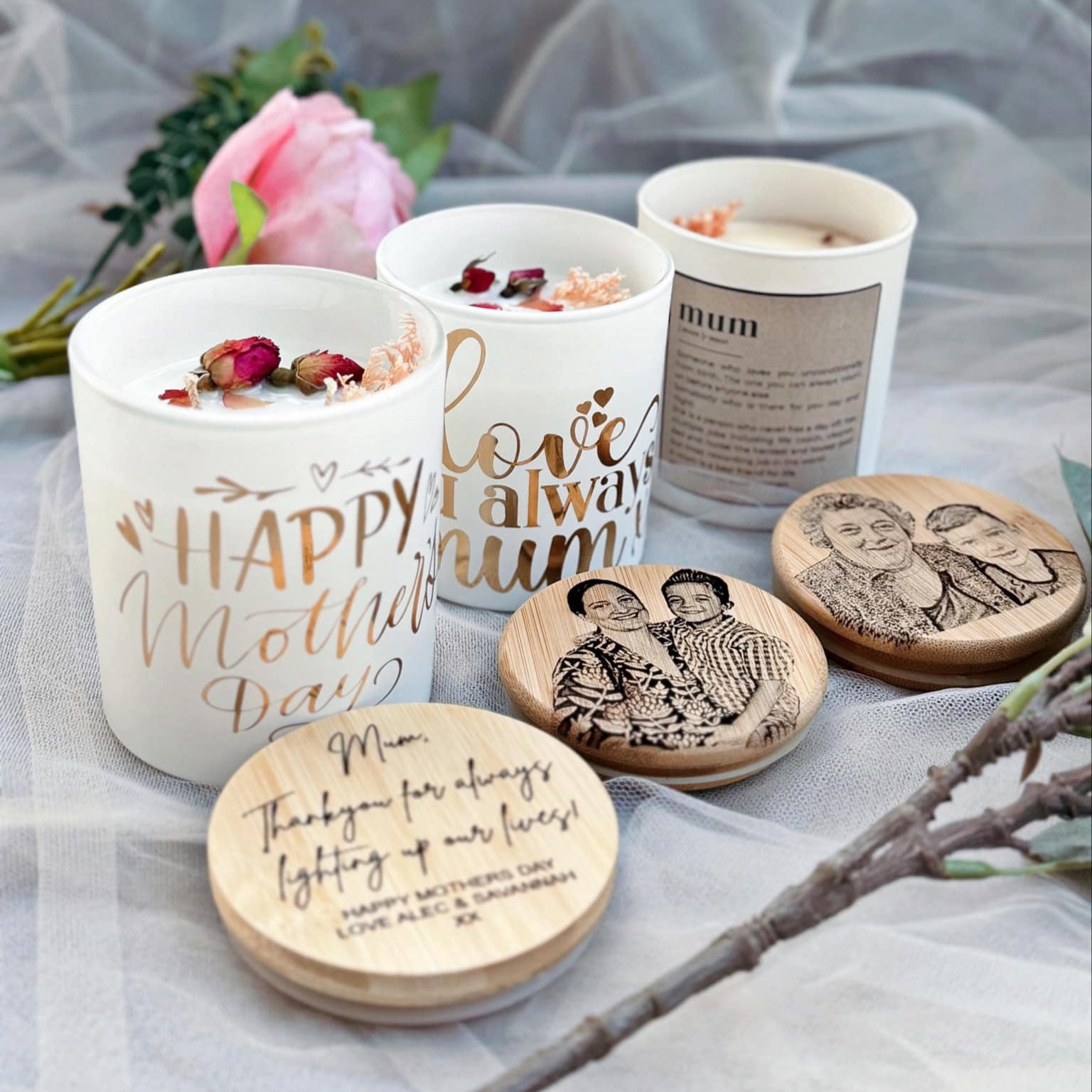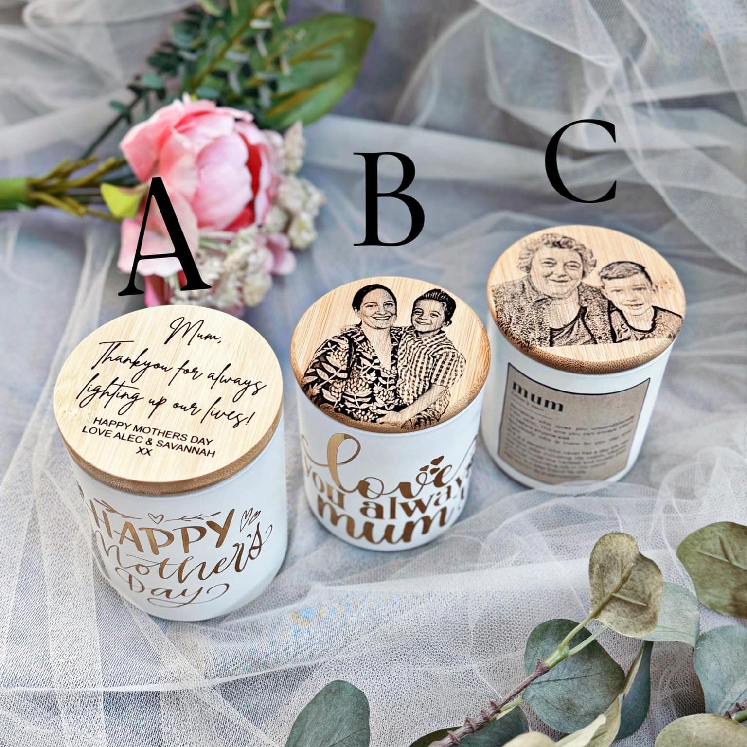 Personalized Handmade Candle with Wood Engraved Picture. Great gift for mothers day, mum birthday gift, nanny birthday or any occasion.